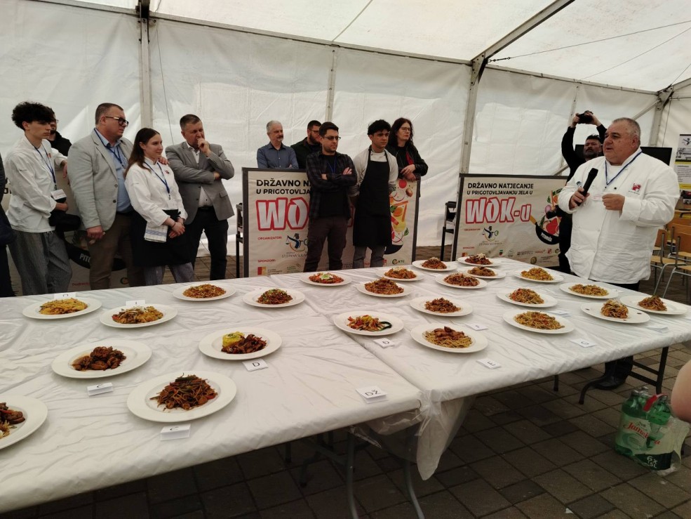 Učenici Petra Golub i Goran Baltić pod mentorstvom strukovnih učitelja Ivane Pleša i Hrvoja Šimunovića sudjelovali su na 3. Državnom i 1. Međunarodnom natjecanju prigotovljavanju jela u WOK-u, 16.travnja u Pitomači. WOK je vrlo nutritivno bogato jelo zbog vrlo brze pripreme kojom se ne uništavaju hranjivi sastojci namirnica. Zbog današnje životne dinamike, izvrsno ga je pripremati u raznim varijantama s raznim namirnicama. Iako ove godine naši učenici nisu osvojili medalju, ovakva su natjecanja izvrsna prilika naučiti nešto novo i stjecati nova iskustva. Na natjecanju je održan i Masterclass prigotovljavanja jela u Wok-u koje je prigotovio chef iz poznatog zagrebačkog Azijskog restorana te natjecanje kuhara profesionalaca. Radujemo se i nadamo do godine ponvno sudjelovati u ovom natjecanju. Hvala organizatoru Darku Baričeviću i njegovim suradnicima iz Srednje škole Stjepana Sulimanca Pitomača na izvrsnoj organizaciji natjecanja. IZVOR: Ivana Pleša